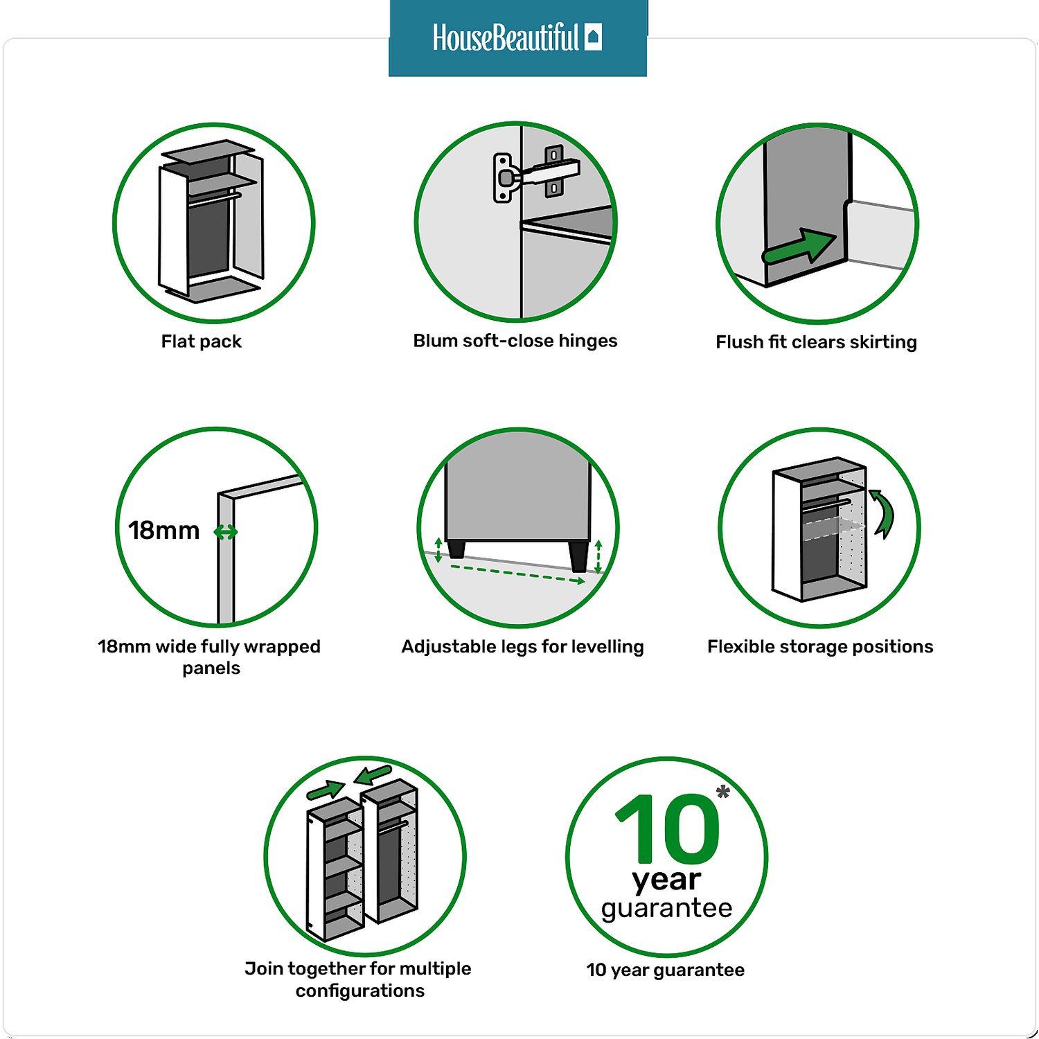 The House Beautiful range is exclusive to Homebase and offers a selection of different finishes and storage configurations to suit your needs. With a range of carcass colours and contrasting door designs, you can select the look to fit your bedroom aesthetic. The House Beautiful range now includes the fully fitted look with this combination pack which includes the wardrobe, end panels, plinth and cornice, meaning you can complete your bedroom with a luxury look. Coordinating chests of drawers are also available separately. This four door wardrobe (2 x double units) features an oak effect internal carcass and includes end panels, plinth and matching cornice all in a finish to match the beautiful luxe gloss grey slab doors. The wardrobe features premium soft close clip-on Blum hinges, two shelves and two hanging rails. You can customise your wardrobe with our additional internal storage options (available separately) including internal drawers, shelves, dividing shelves and extra hanging rails. Choose your handles from our range of both traditional and modern to suit your desired look.